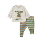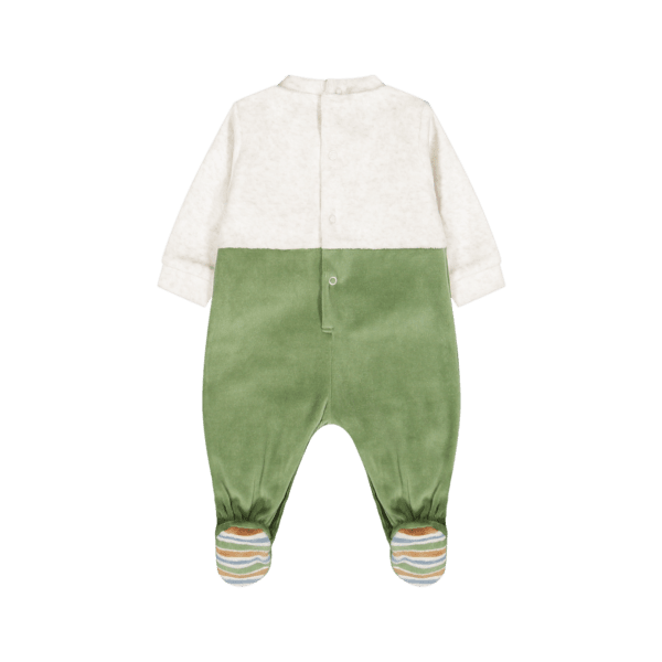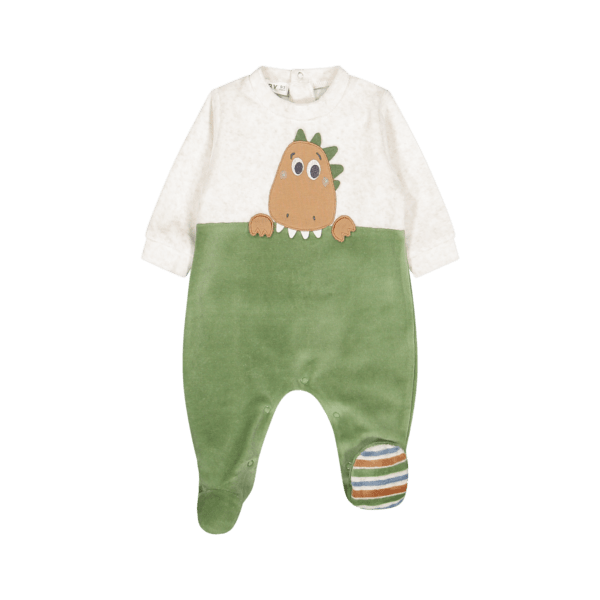 Tutina con piede realizzata in soffice ciniglia nei colori del verde laguna, biscotto e azzurro. Sul petto con ricamato un buffo dinosauro, dettagli in applicazione sul fondo della gamba. Pratica apertura con bottoni a pressione sull’interno gamba e sul dietro.