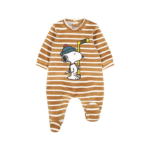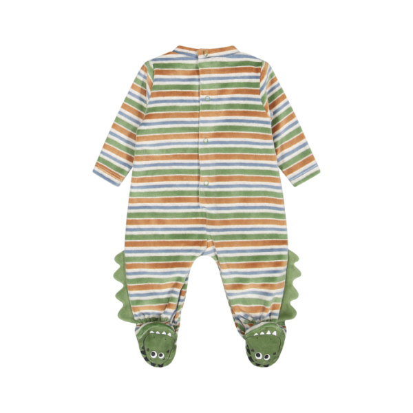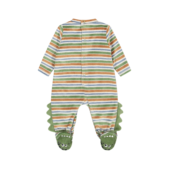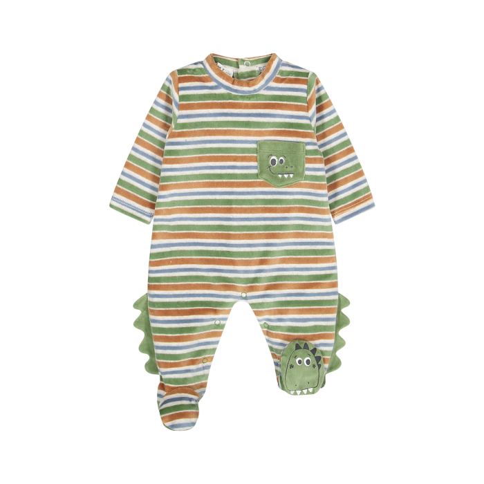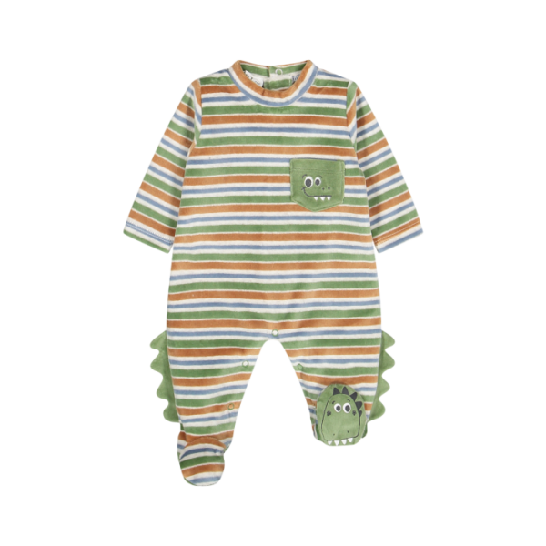 Tutina con piede realizzata in soffice ciniglia rigata nei colori del verde laguna, biscotto e azzurro. Taschino sul petto con ricamato un buffo dinosauro, dettagli in applicazione sul fondo della gamba. Pratica apertura con bottoni a pressione sull’interno gamba e sul dietro.